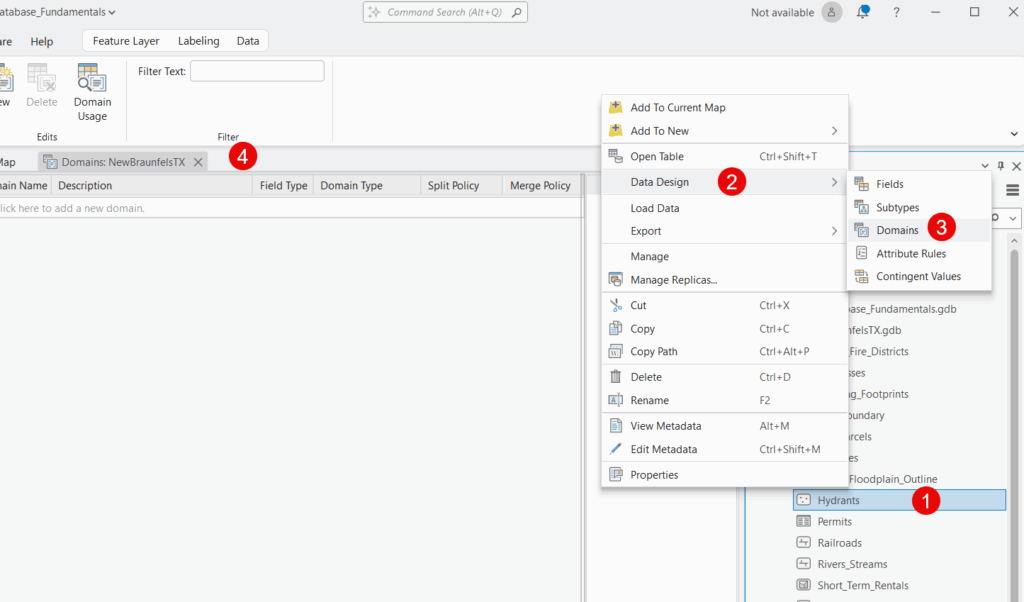 - Right-click on the feature class and select Data Design | Domains