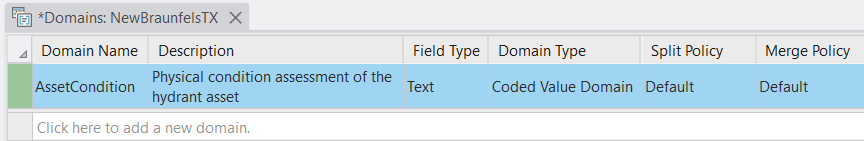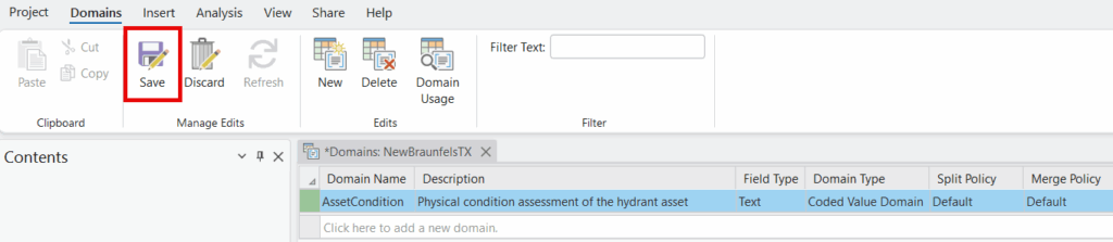On the Domains context tab click the Save button. The AssetCondition domain is now available for use in your geodatabase.