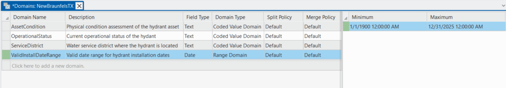 In this guide, we’ll walk through the complete process of creating and applying both coded value domains and range domains using a realistic example: a fire hydrant feature class for a city utilities department.