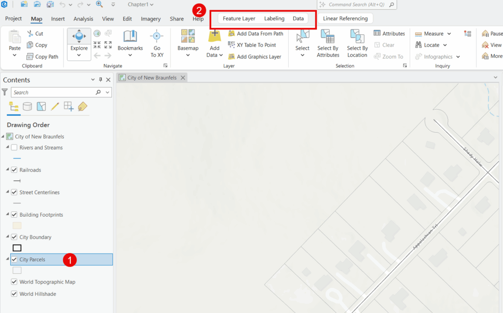 - Select a feature layer, and you’ll see three contextual tabs appear: Feature Layer, Labeling, and Data