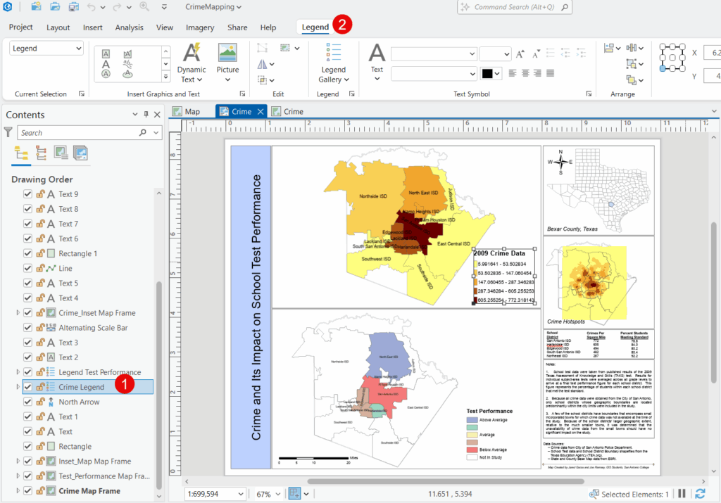When you add elements to a layout, each element type gets its own contextual tab. Add a legend and you’ll see a Legend tab. Insert a map frame and you’ll get a Map Frame tab. Add a scale bar and a Scale Bar tab appears. This pattern continues for every layout element: north arrows, text, pictures, charts, and tables all have their own dedicated contextual tabs with element-specific formatting and configuration options.